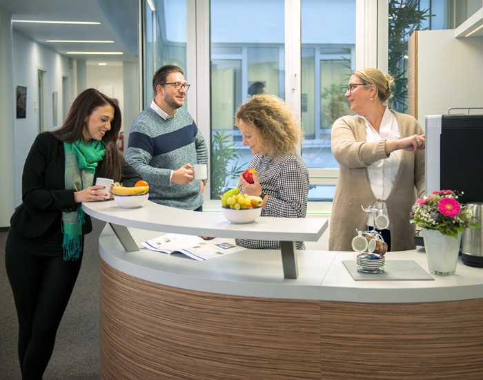 Unser betriebliches Gesundheitsmanagement hält viele Angebote bereit, damit Sie auch gesund das Rentenalter erreichen. So gibt es zum Beispiel Bewegungs- und Entspannungsangebote direkt am Arbeitsplatz oder Tipps für die richtige Ernährung. Darüber hinaus stehen Wasser, Kaffee und Obst für alle kostenfrei zur Verfügung.