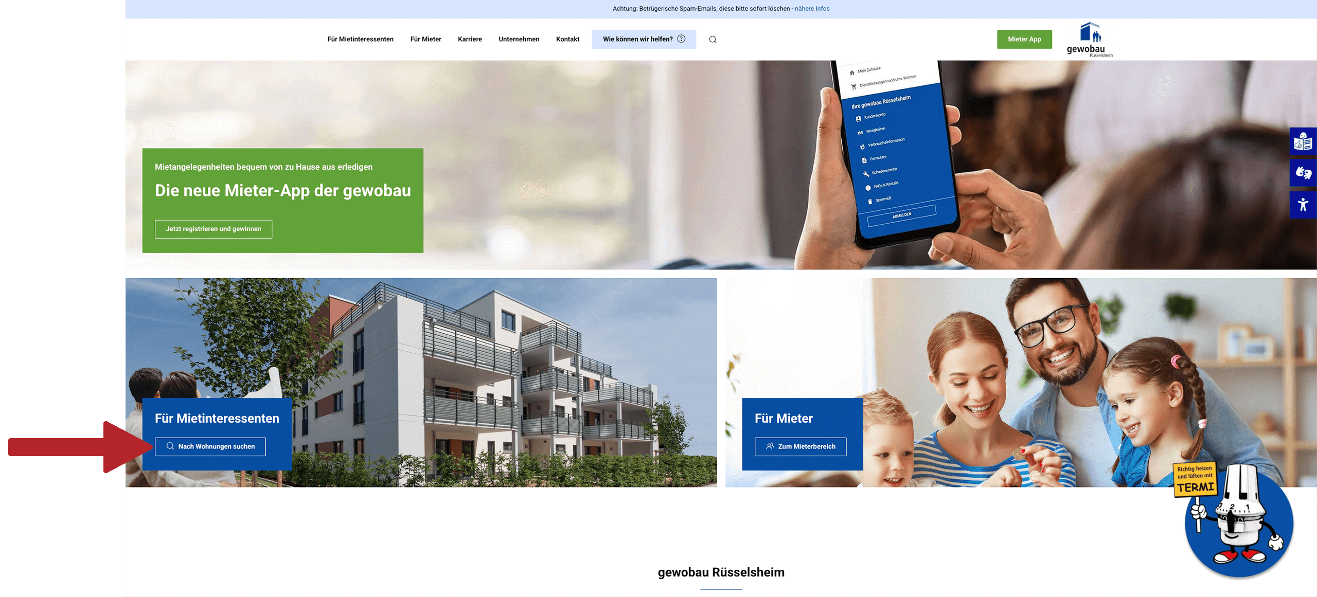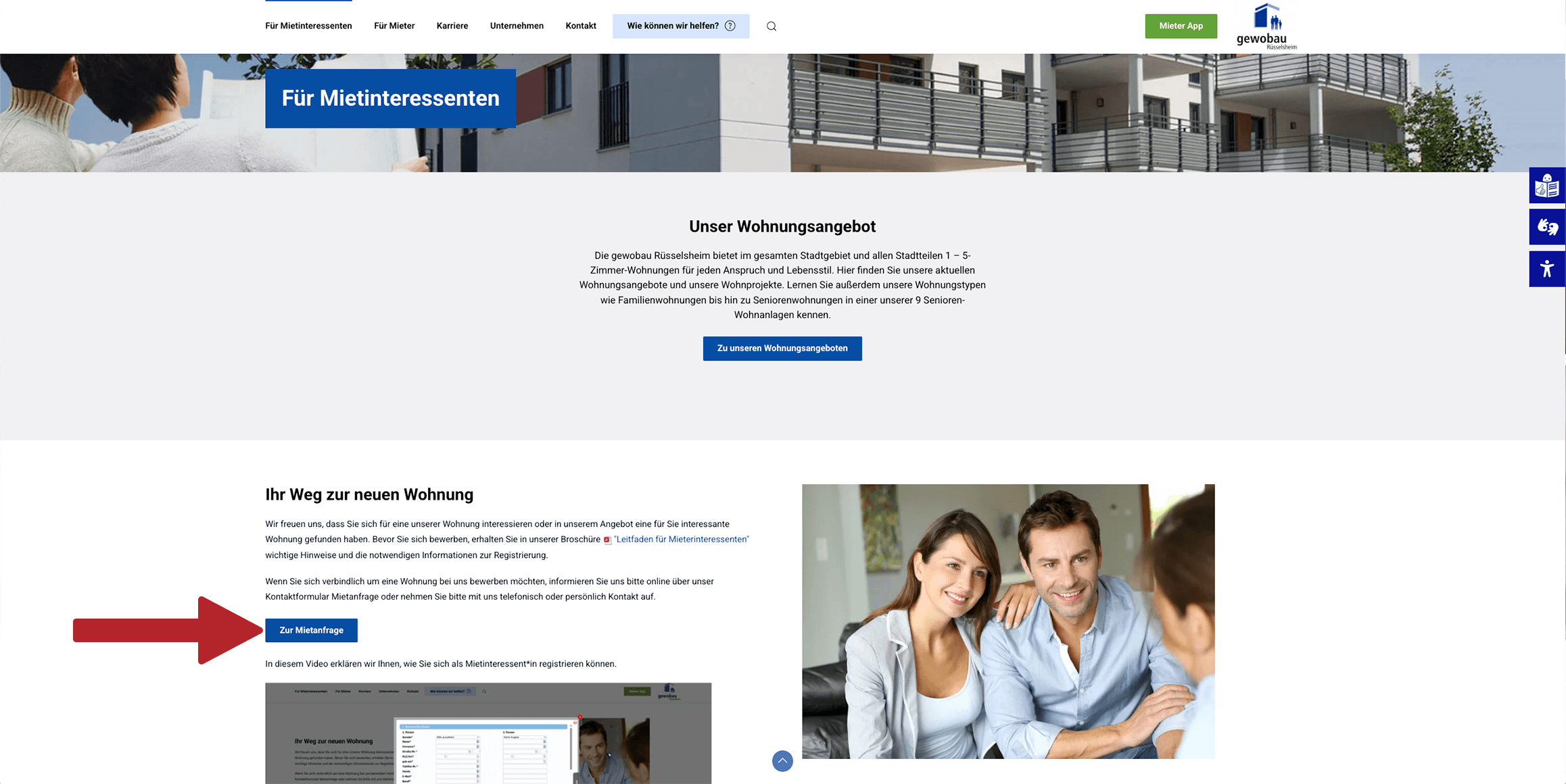 Das Haupt-Menü hat verschiedene Punkte:- Für Miet-Interessenten: Infos zu freien Wohnungen