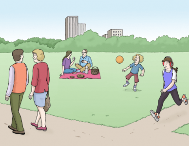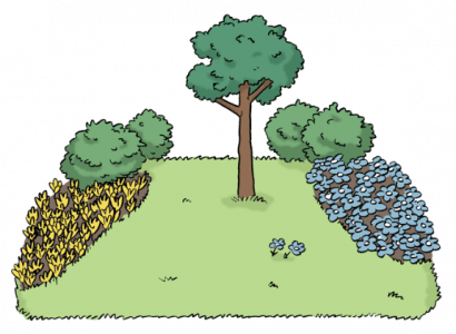 - grüne Plätze mit Gras, Bäumen und Sträuchern